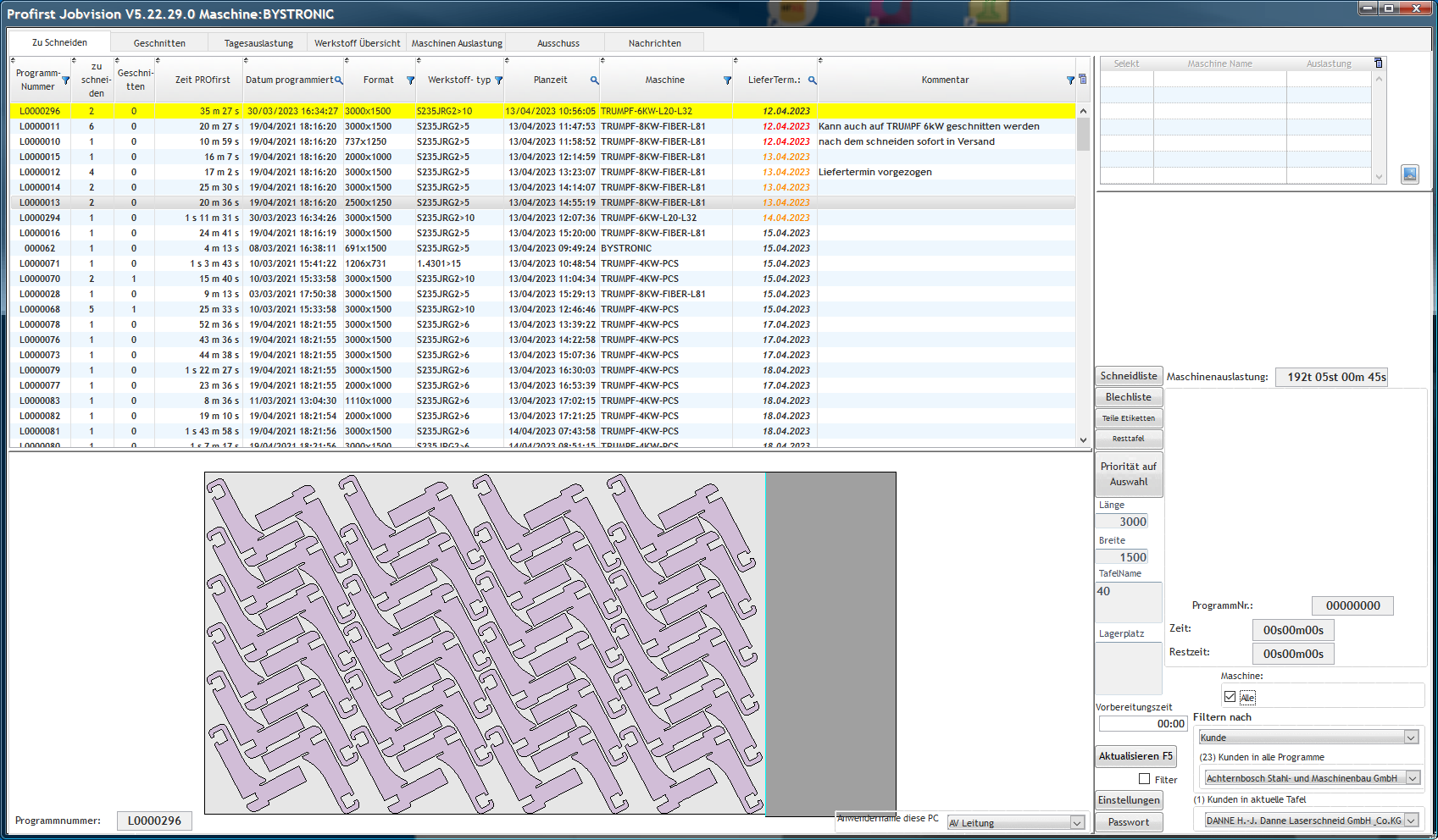 Um Teile schneller von der Maschinen zu entladen und sortieren, können Sie in unterschiedliche Farben dargestellt werden abhängig von Kriterien wie AuftragsNr., Kunde, nächste Arbeitsgang, Baugruppe etc.